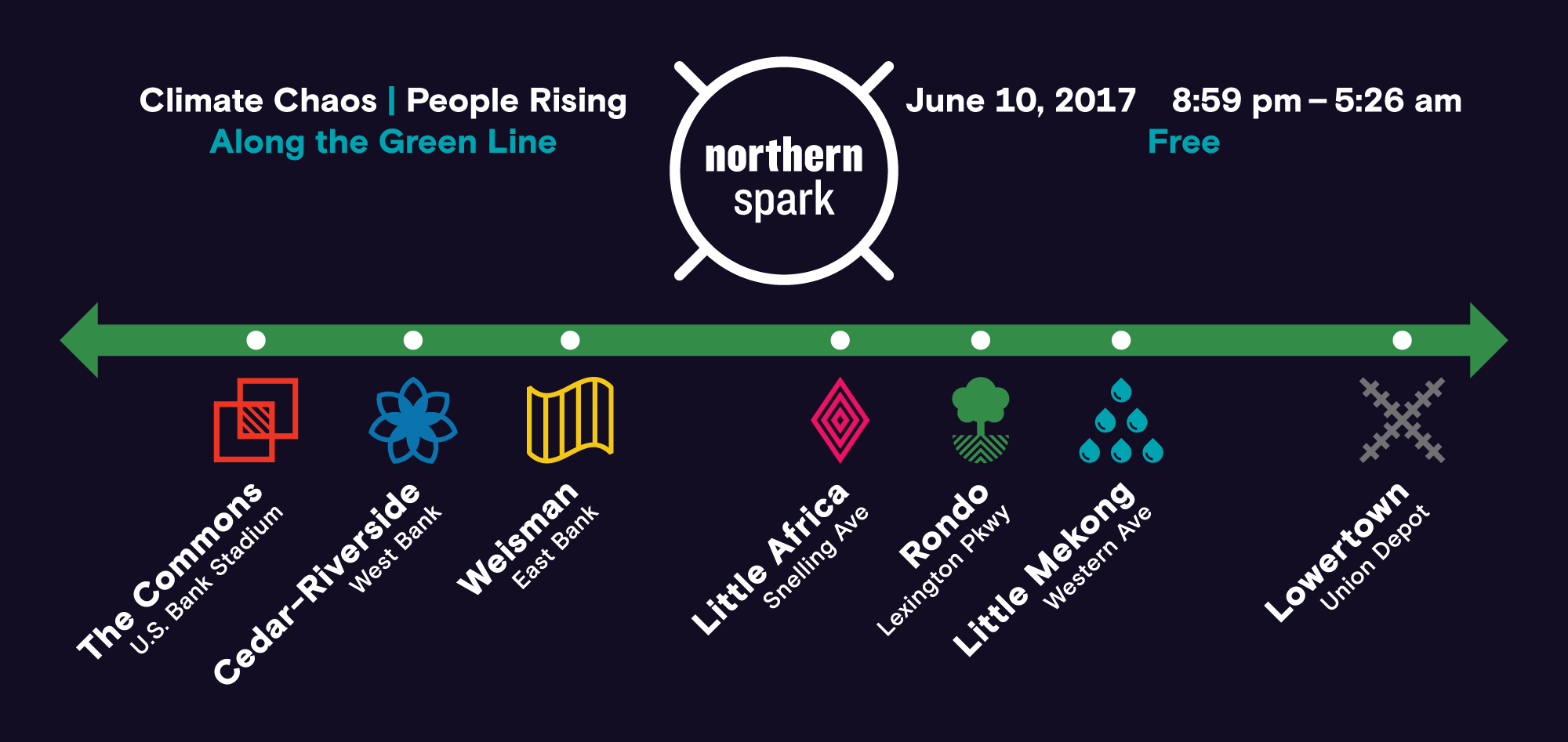 Northern Spark 2017 will illuminate and draw audiences to neighborhoods and public spaces all along the METRO Green Line, connecting Minneapolis and St. Paul. Experience the largest Northern Spark yet, with nearly 70 art projects organized around neighborhood nodes: Cedar Riverside/West Bank, Weisman Art Museum/East Bank, Little Africa/Snelling, Rondo/Lexington, and Little Mekong/ Western. In downtown Minneapolis the festival moves from its usual river location to The Commons, the new green space at Portland and 5th, and culminates in Saint Paul at Union Depot, the Green Line terminus in Lowertown.